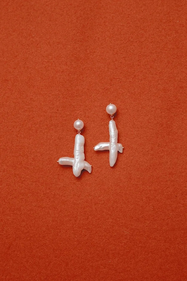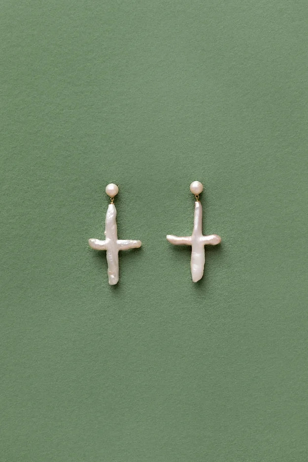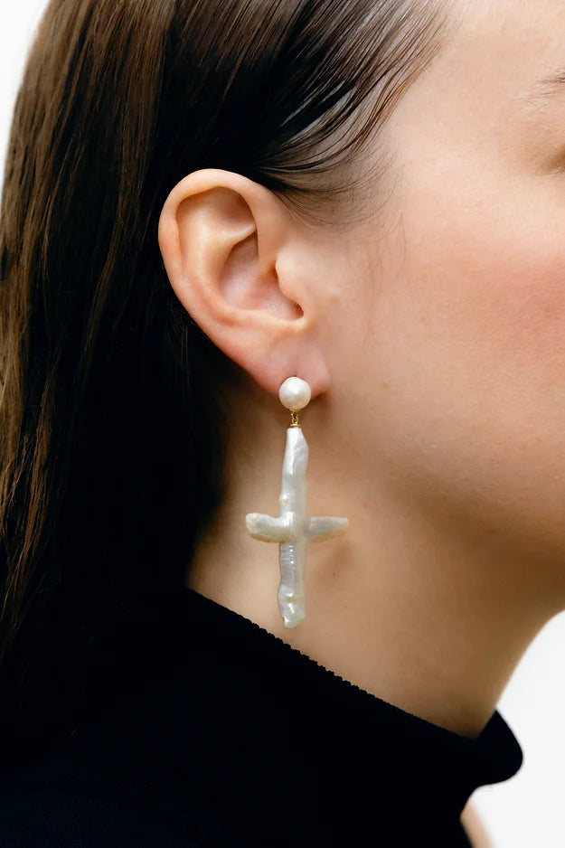 O brinco Cruzes integra a coleção Pérolas, que nasce do fascínio pelo mar. Todas as peças são feitas à mão, a partir de pérolas barrocas garimpadas conhecidas por suas disformidades, trazendo assim sua estranheza para nosso dia a dia numa releitura de clássicos que nunca saem moda.