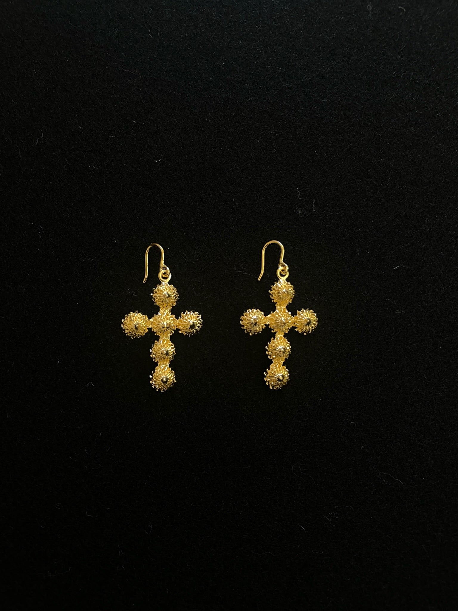 Nosso brinco em formato de crucifixo integra nossa coleção SUSPIRO – e é feito a partir de seis suspiros soldados um ao outro. Para a criação do brinco nós fizemos uma releitura de montagens tradicionais de joias da era medieval. A peça acompanha um fecho gancho. Toda peça é feita à mão em latão com banho em ouro 18k, propondo uma sutileza complexa de detalhes que se revelam a partir dos acabamentos foscos e brilhantes na mesma peça.