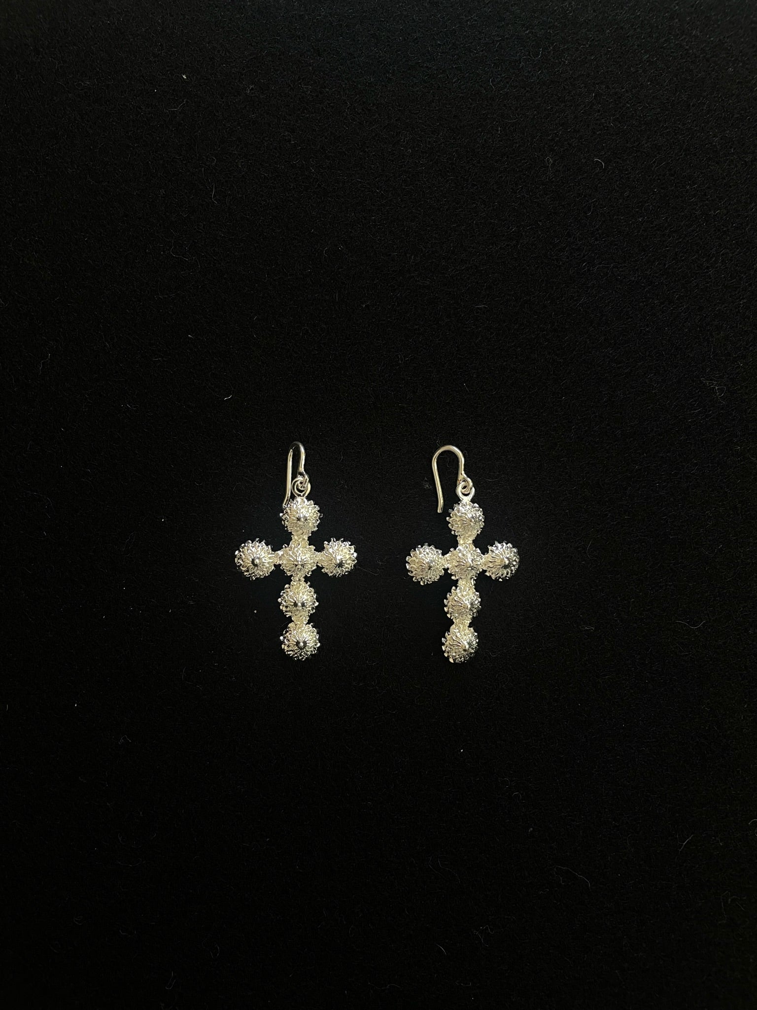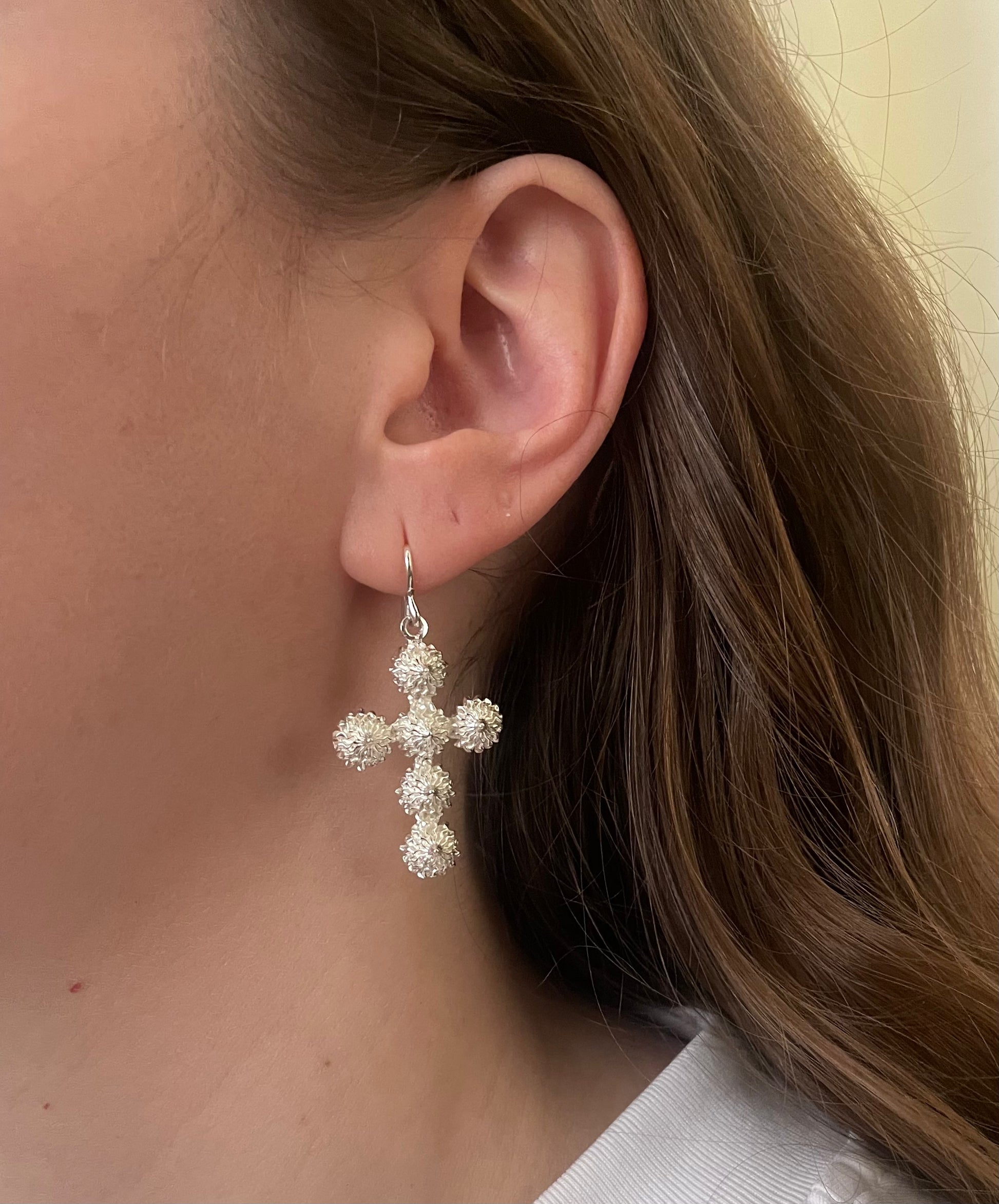 Nosso brinco em formato de crucifixo integra nossa coleção SUSPIRO – e é feito a partir de seis suspiros soldados um ao outro. Para a criação do brinco nós fizemos uma releitura de montagens tradicionais de joias da era medieval. A peça acompanha um fecho gancho. Toda peça é feita à mão em latão com banho em prata 925, propondo uma sutileza complexa de detalhes que se revelam a partir dos acabamentos foscos e brilhantes na mesma peça.