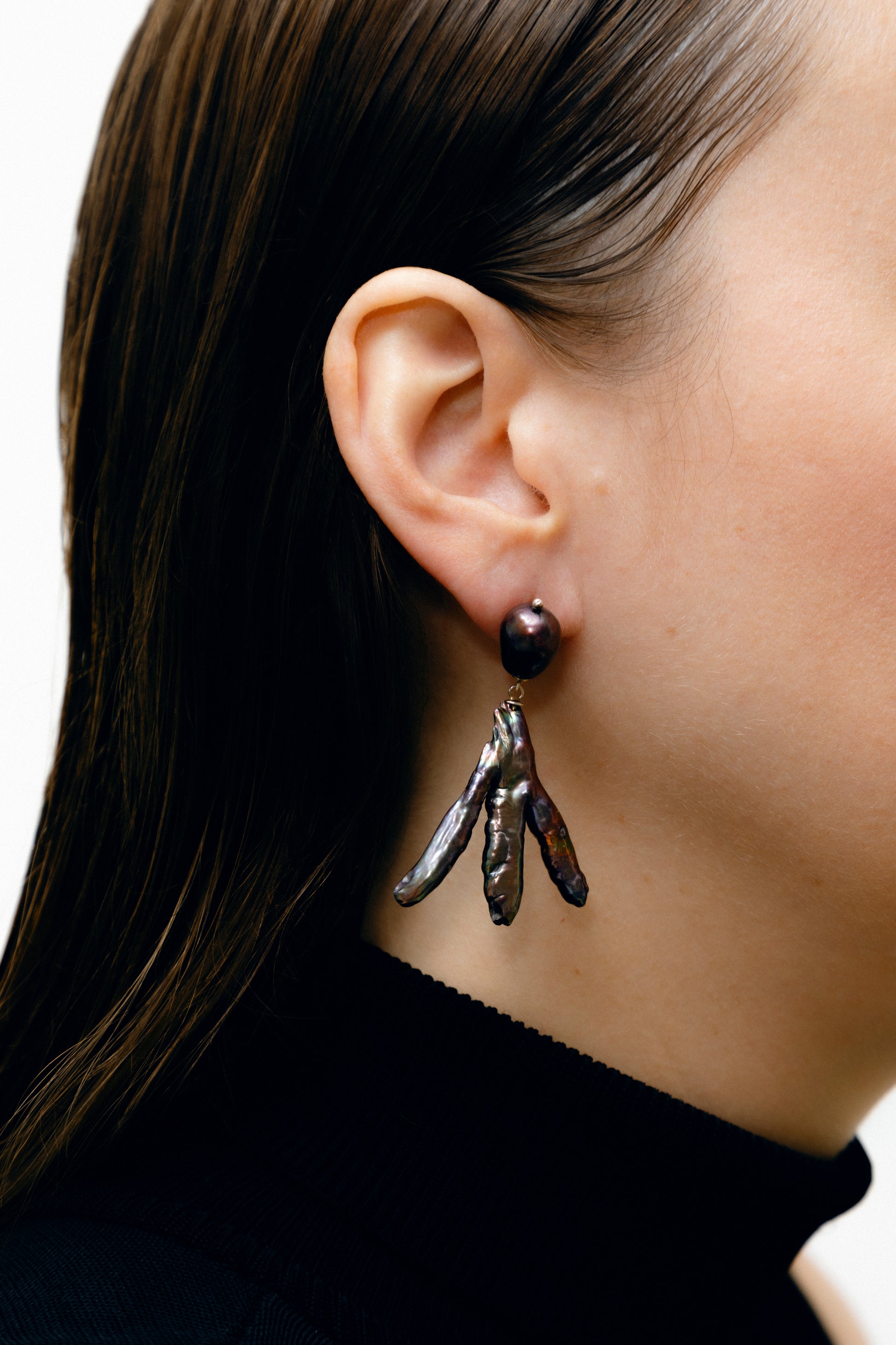 Brinco de pérola barroca negra em formato tridente com montagem em prata.