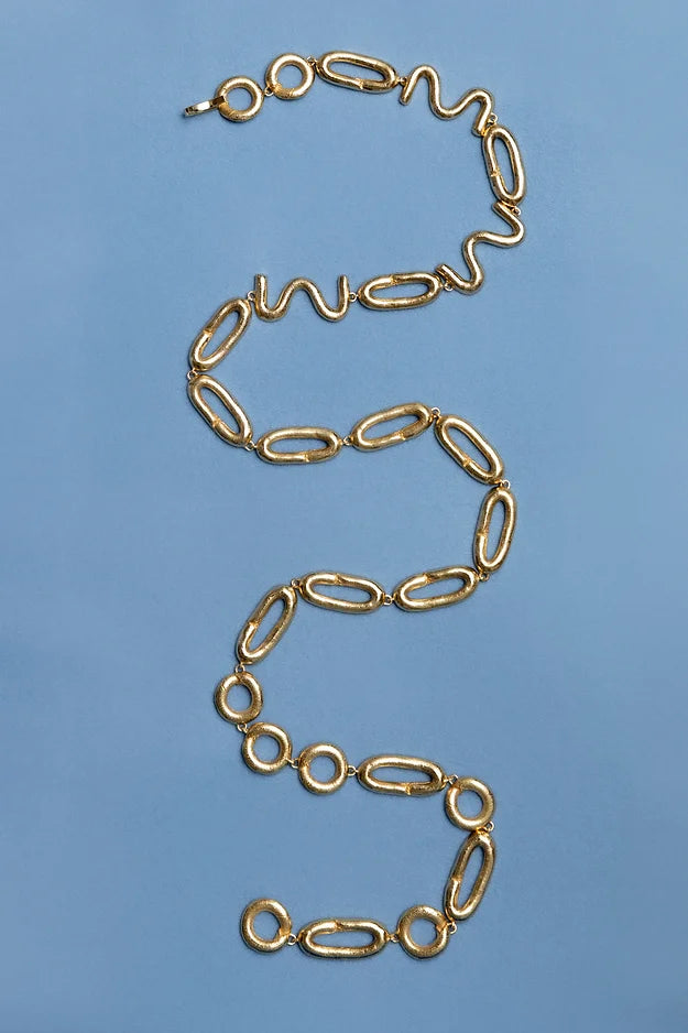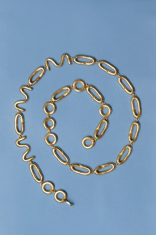 O cinto Cosima é feito em latão com banho de ouro 18k e nasce a partir de um complexo processo artesanal. Todas as peças foram esculpidas à mão e o encaixe de cada uma delas é feito individualmente. As criações desenvolvidas em latão passam por um trabalho de montagem minucioso com técnica de montagem de joalheria. A peça pode ser usada como colar de colo ou bem justa como um choker, apenas ajustando pelos elos.