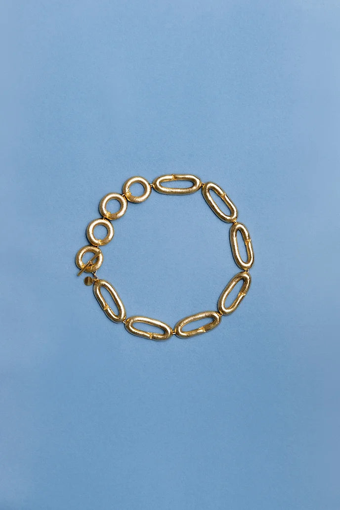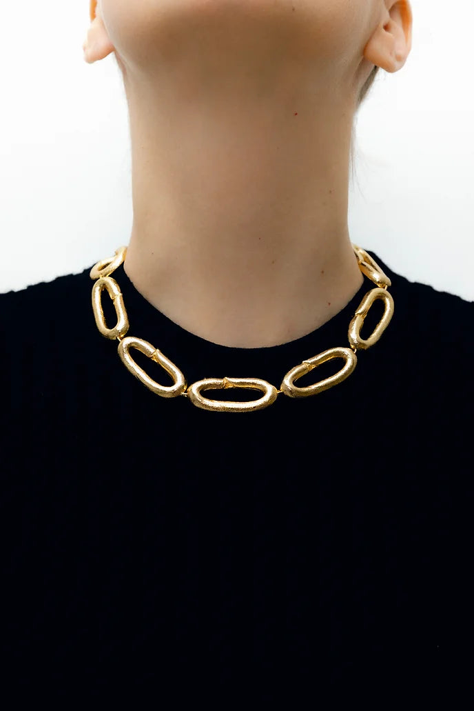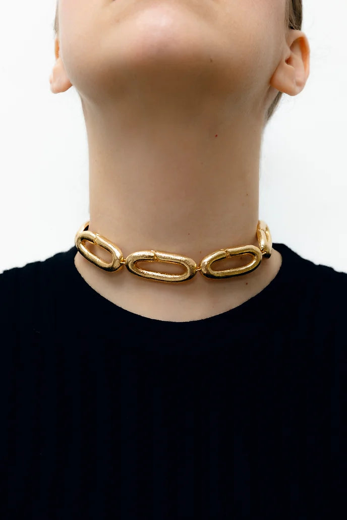 O colar Ilaria é feito em latão com banho de ouro 18k e nasce a partir de um complexo processo artesanal. Todas as peças foram esculpidas à mão e o encaixe de cada uma delas é feito individualmente. As criações desenvolvidas em latão passam por um trabalho de montagem minucioso com técnica de montagem de joalheria. A peça pode ser usada como colar de colo ou bem justa como um choker, apenas ajustando pelos elos.