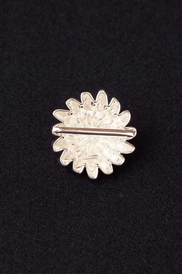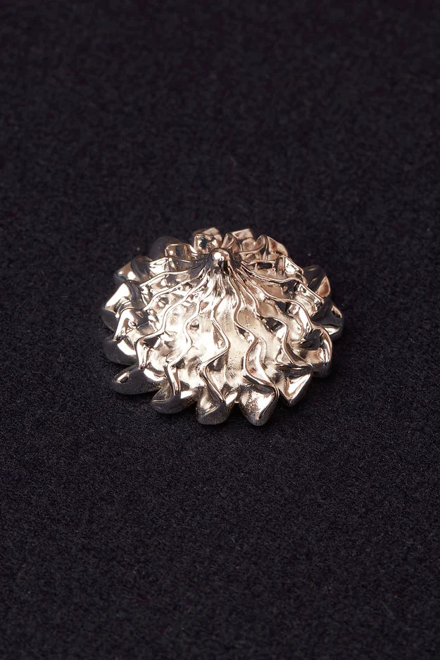 Todas são feitas à mão em latão com banho em prata 925, propondo uma sutileza complexa de detalhes que se revelam a partir dos acabamentos foscos e brilhantes na mesma peça. Em nossa peça escultural, o suspiro toma forma e se converge em um ponto central a partir das laterais, que possuem um efeito rajado.